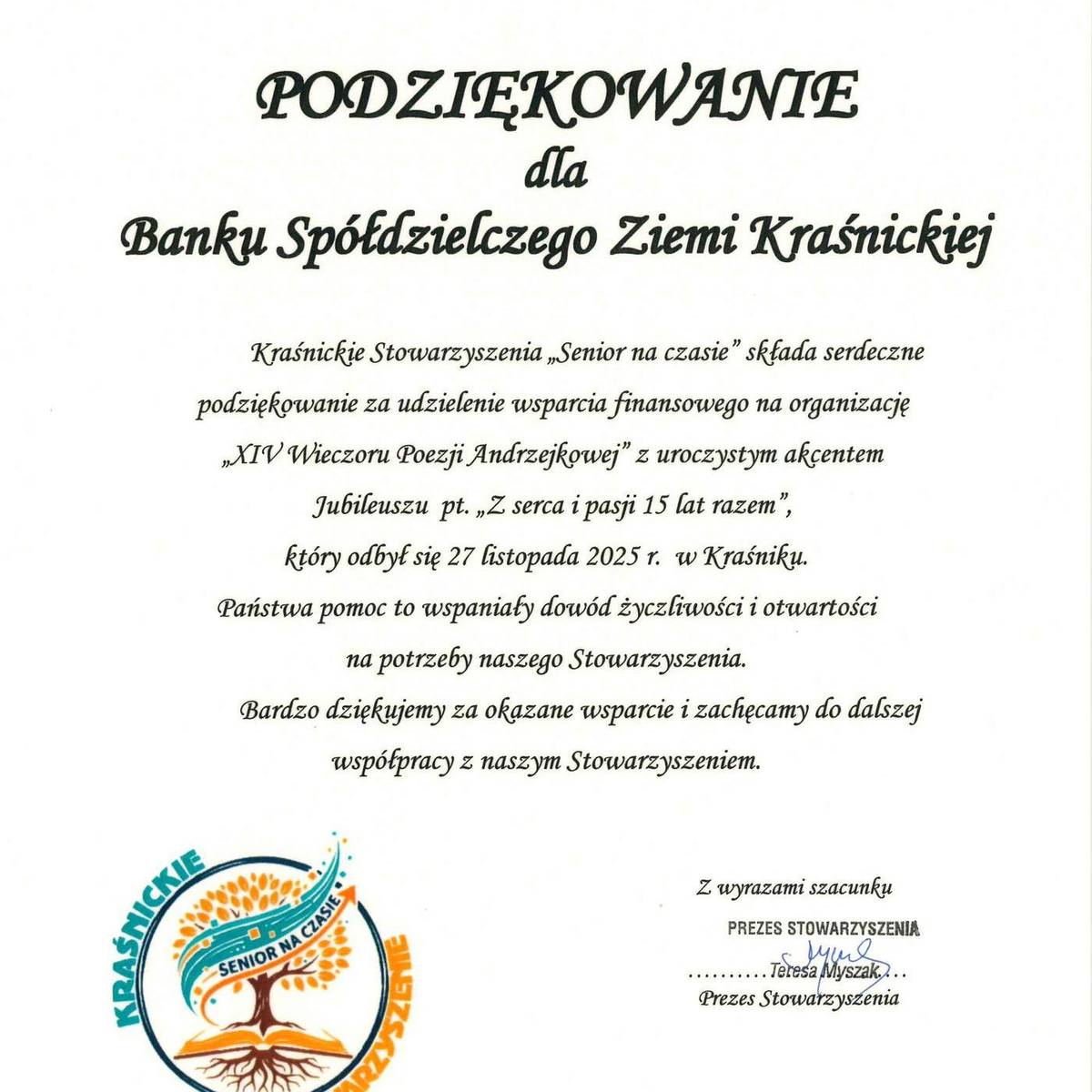 Bank Spółdzielczy Ziemi Kraśnickiej, oddział w Gościeradowie, po raz kolejny wsparł Organizatorów Międzydiecezjalnego Przeglądu Pieśni Maryjnej, za co otrzymaliśmy stosowne podziękowania.