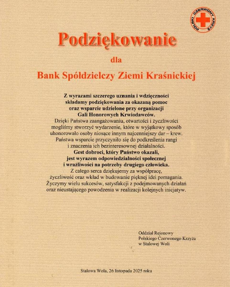 26. listopada 2025 roku w Stalowej Woli odbyła się uroczysta gala dla krwiodawców, która była nie tylko okazją do uhonorowania osób, które bezinteresownie dzielą się tym, co najcenniejsze, ale również pięknym świadectwem solidarności, empatii i ogromnych serc, jakie biją w naszej społeczności.
