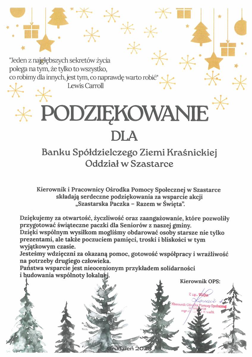 Pracownicy Banku Spółdzielczego Ziemi Kraśnickiej w Kraśniku, Oddział w Szastarce, z radością włączyli się do Akcji Charytatywnej „SZASTARSKA PACZKA” Razem w Święta.